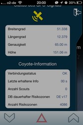 Über die App wird der Fahrer unter anderem über seinen genauen Standort, seinen Verbindungsstatus sowie über die Anzahl der Scouts und Risikozonen informiert.
