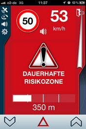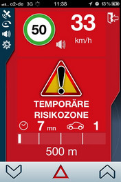 Diese Zone meldet bekannte Unfallzonen mit oder ohne festen Blitzer (Blitzer an roten Ampeln), oder Gefahrenzone mit mittlerer Geschwindigkeit, von den Behörden auch Streckenradar« genannt.