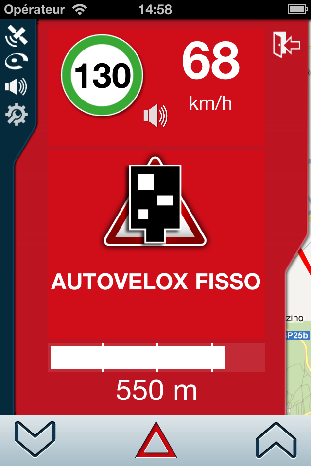 In prossimità di un autovelox mobile segnalato compare la seguente schermata. Sullo schermo viene visualizzato: il limite di velocità in vigore, la distanza dall’autovelox e l’ora dell’ultima conferma (o prima segnalazione) di presenza autovelox mobile.