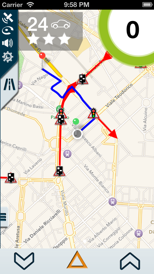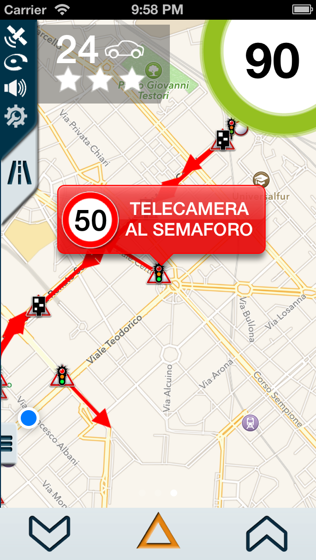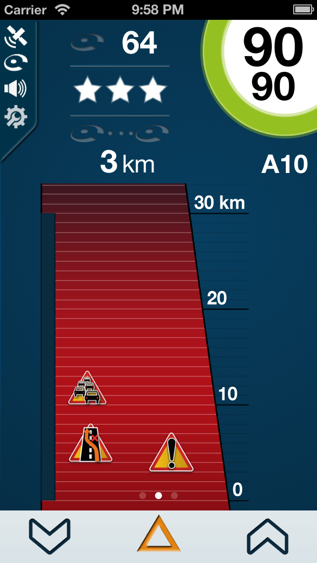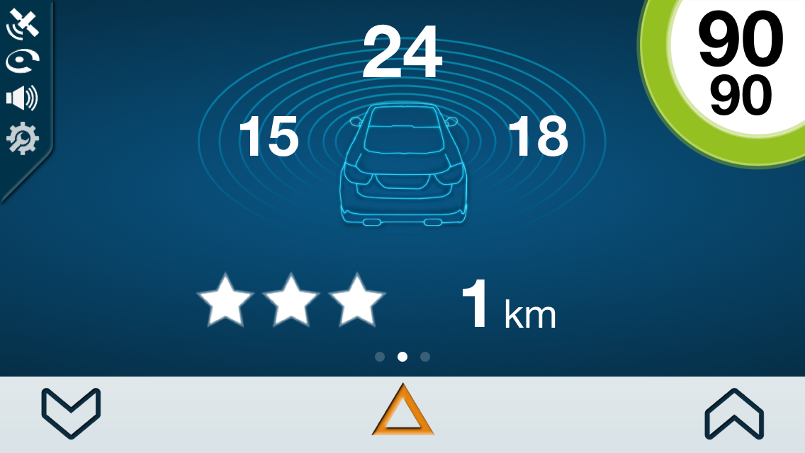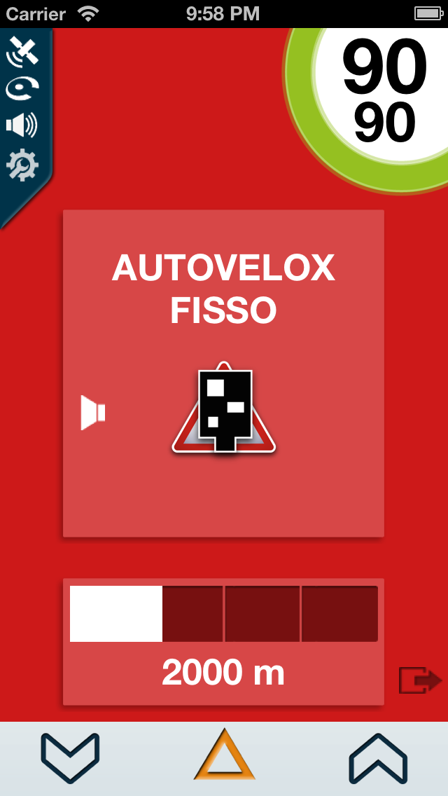 In questa schermata vengono visualizzati velocità, il nome della strada in cui si guida, i pericoli presenti (autovelox fissi, mobili, TUTOR…) nel tratto stradale davanti a noi , il numero di esploratori, la distanza dall’esploratore più vicino e l'indice di affidabilità media nei successivi 30 km.