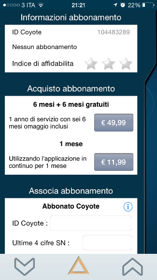 Scaduto il periodo di prova, per continuare ad utilizzare i servizi iCoyote dovraiacquistare un abbonamento o inserire il codice ID di un dispositivo Coyote (IL COYOTE, Mini Coyote Plus, Mini Coyote) Per farlo è necessario inserire i dati per la registrazione sul tuo account on line (vedi punto 3)