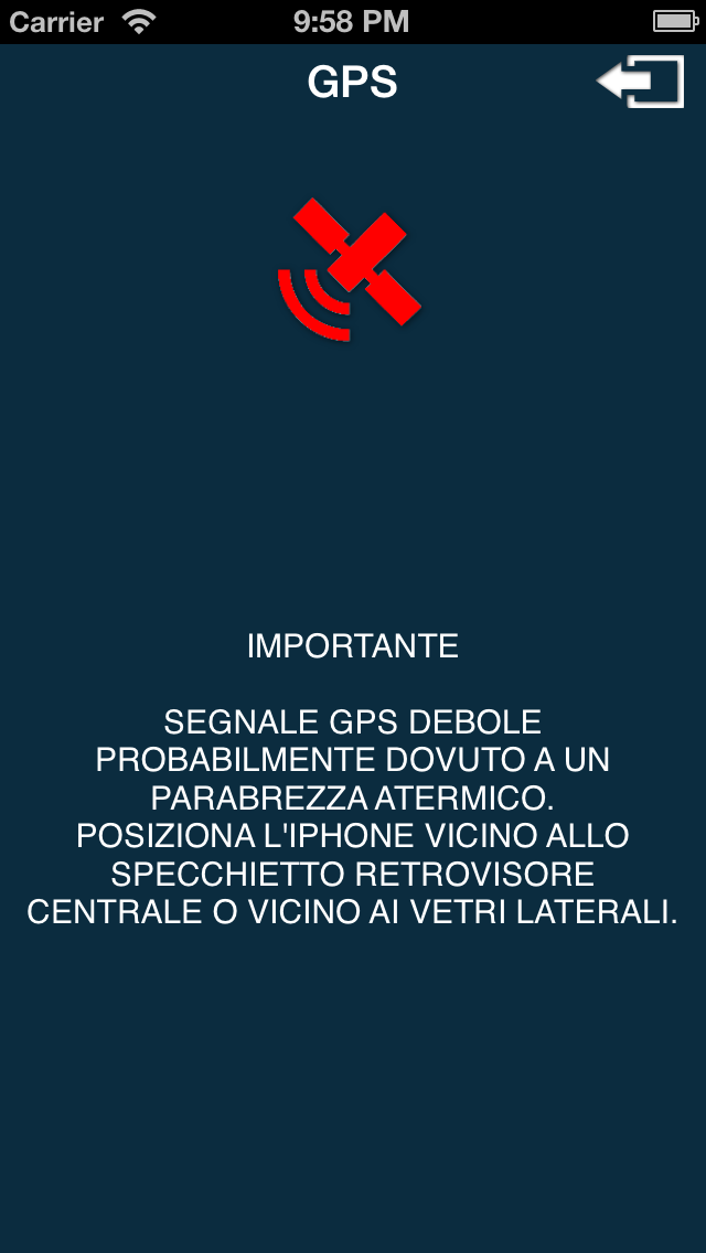 All’accensione, la schermata principale ti mostrerà la velocità del veicolo calcolata dal GPS iPhone e la qualità del segnale GPS.