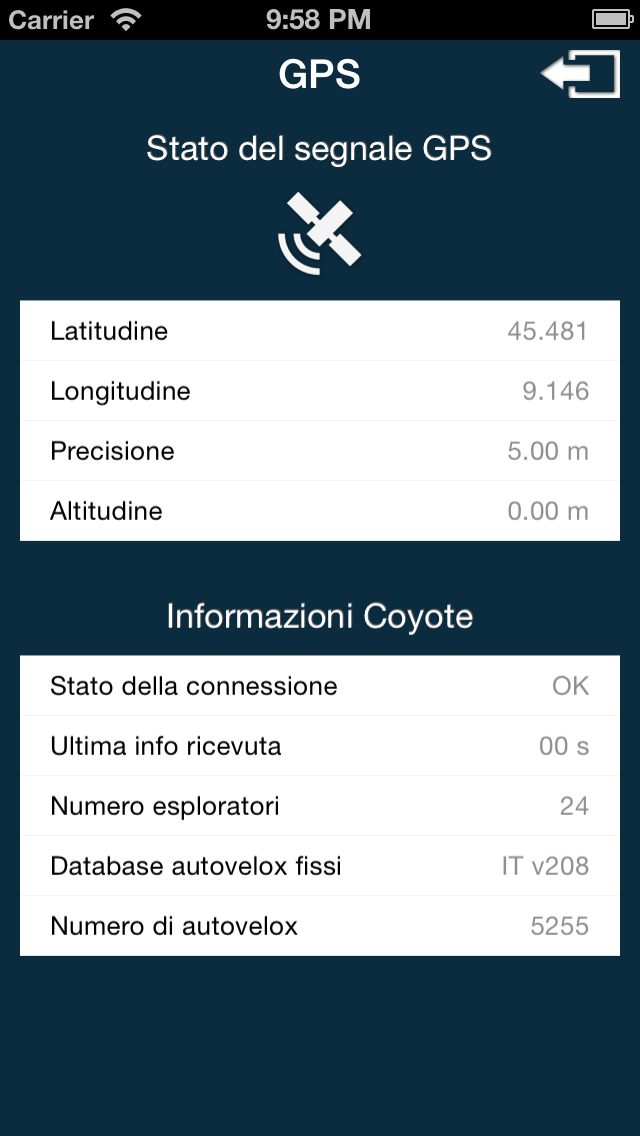 Se l'icona Coyote è rossa, allora non si è coperti dal proprio operatore e non sarà possibile ricevere da Coyote informazioni in tempo reale