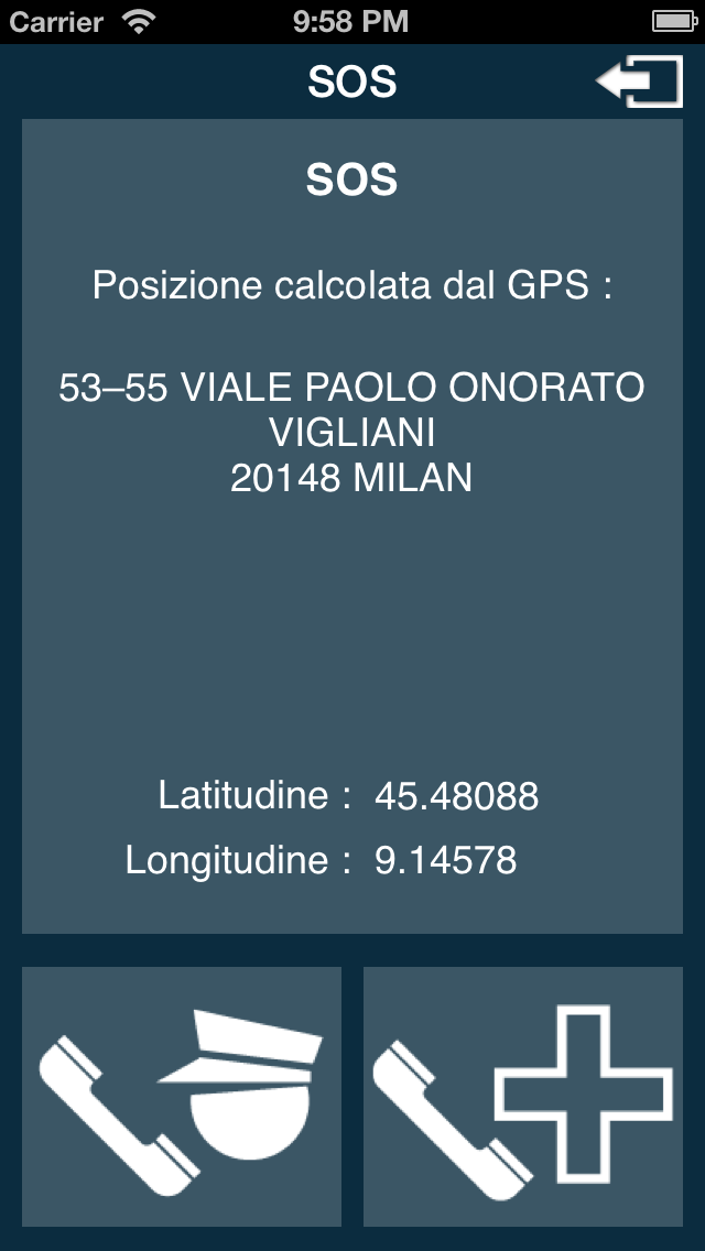 Il pulsante SOS invia una richiesta di assistenza di emergenza e fornisce informazioni sulla posizione corrente (indirizzo e le coordinate GPS). Sono presenti due pulsanti per chiamare rapidamente la Polizia o i mezzi di soccorso in caso di incidente o di cause di forza maggiore.