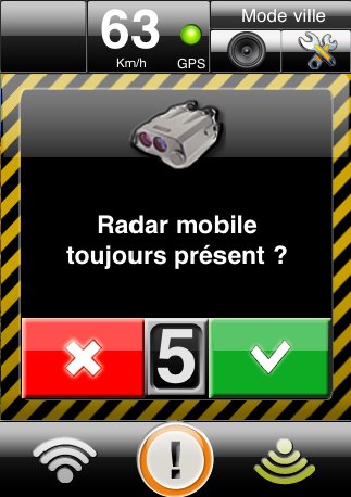L’écran de confirmation de radar mobile est affiché pendant 10 secondes après le dépassement d’un radar mobile signalé. Merci de confirmer sa présence, ou sa disparition, à l’aide du bouton correspondant dans le temps imparti.