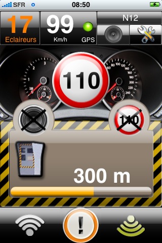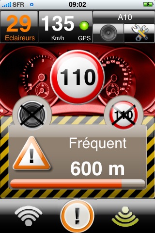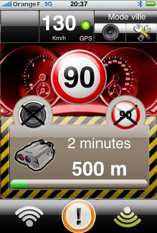A l’approche d’une zone de contrôle, l’écran ci-dessous est affiché. Il présente la vitesse limite autorisée, la distance qui vous sépare de la zone, et la fréquence d’observation des radars mobiles dans le passé (très fréquent, fréquent, peu fréquent).