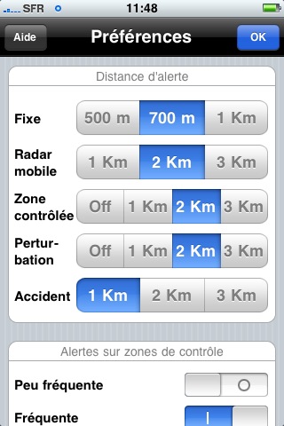 N.B. Afin de réduire le risque de fausses alertes dans les zones denses, les distances d’alerte de certains radars fixes et de certaines zones de contrôle ont été figées en fonction de la typologie de la route. Un changement de la distance d’alerte par défaut restera donc sans effet sur ceux-ci.